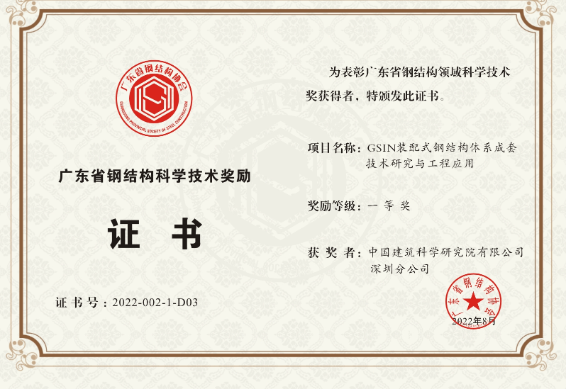 GSIN 装配式钢结构建筑成套技术的应用是建造方式的重大变革,是推进新型建筑工业化发展的重要举措,有利于节约资源能源、减少施工污染,有利于促进建筑业与信息化、工业化深度融合,是推进建筑业绿色发展、提高建筑质量和安全性的重大举措。项目科研成果获2022年度广东省钢结构协会科技进步一等奖。