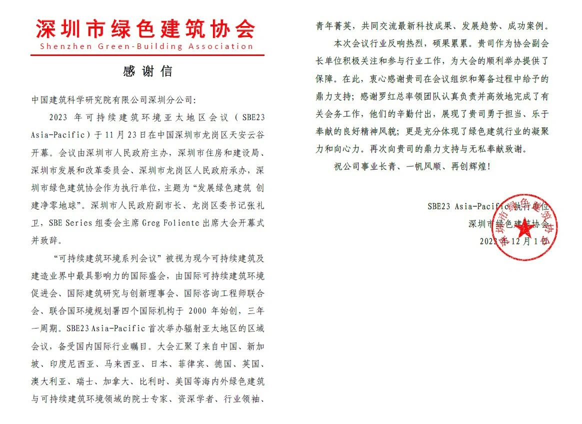 近期,深圳市绿色建筑协会向尊龙凯时·(中国区)人生就是搏! 深圳分公司发来感谢信,对尊龙凯时·(中国区)人生就是搏! 深圳分公司支持保障2023年可持续建筑环境亚太地区会议顺利举办表示感谢。