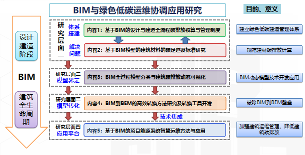 科研团队主要解决BIM与绿色低碳协同发展中各类信息模型数据无法共享、信息模型转换工具缺失的问题和BIM在能耗与碳排放量计算、碳足迹与碳排放监测、能源与碳排放运维管理方面的技术管理协同问题。针对BIM低碳技术管理协同问题,将通过基于BIM模型的建筑材料的碳足迹及标准研究和设计与建造全流程碳排放核算与管理制度研究,编制科学合理的建筑材料碳足迹评级和碳排放核算标准,实现建筑设计及建造阶段绿色低碳建造管理体系搭建。针对BIM低碳技术支持协同方面,将通过BIM到BEM的高效转换方法研究及转换工具开发、基于BIM 的能源系统实时仿真与智慧运维技术研究与应用等,破除BIM到BEM的信息壁垒,实现项目基于BIM协同的绿色智慧低碳运维,有效降低深汕粮食储备库项目的能源消耗和碳排放。