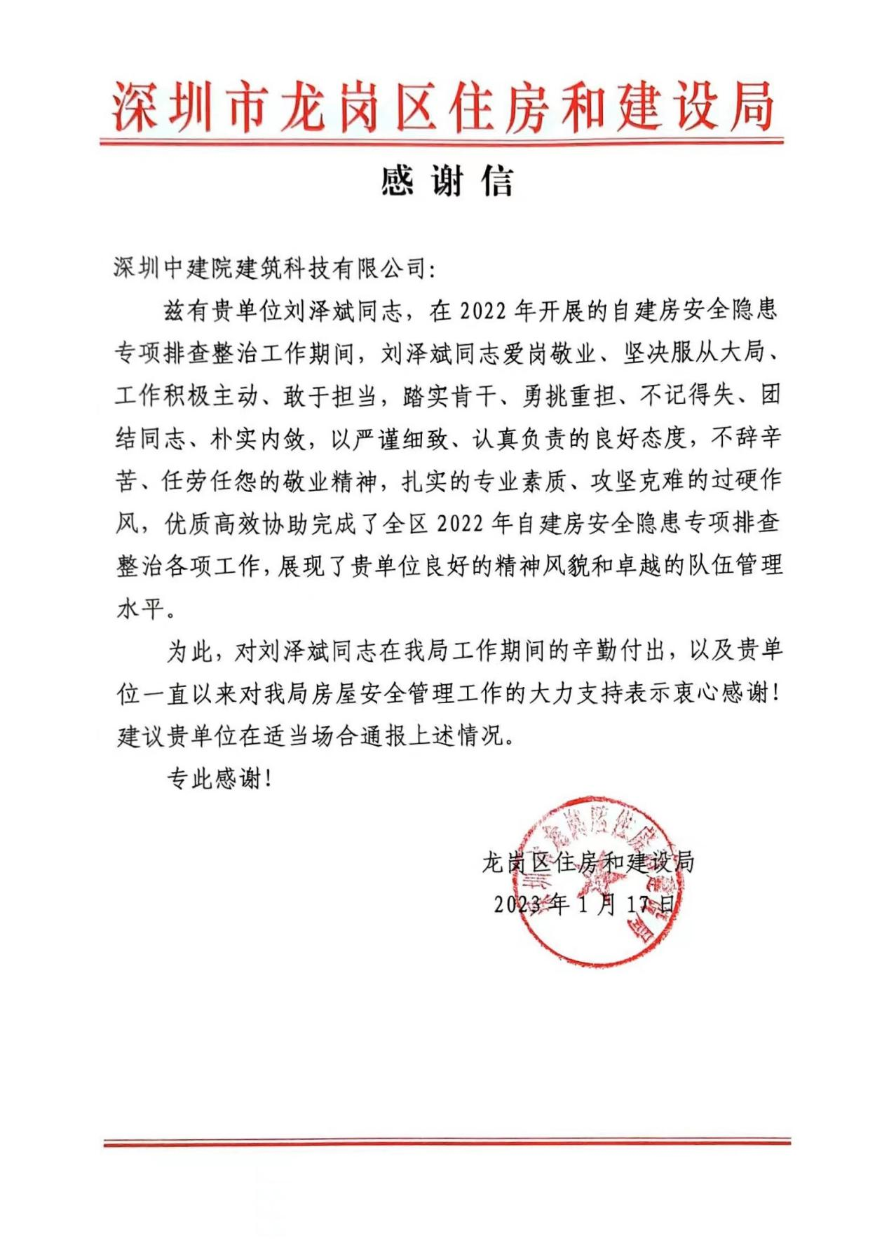 信中充分肯定和赞扬了深圳中建院长期以来对龙岗区住房和建设局房屋安全管理工作的突出贡献,并着重强调在2022年开展的自建房安全隐患专项排查整治工作期间,深圳中建院刘泽斌同志作为驻点代表,爱岗敬业、坚决服从大局、工作积极主动、勇于担当,勇挑重担、不计得失,以严谨细致、认真负责的良好态度,不辞辛苦、任劳任怨的敬业精神,扎实的专业素质、攻坚克难的过硬作风,优质高效协助完成了龙岗区2022年自建房安全隐患专项排查整治各项工作,以实际行动发挥央企精神、展现央企担当、彰显央企风貌。