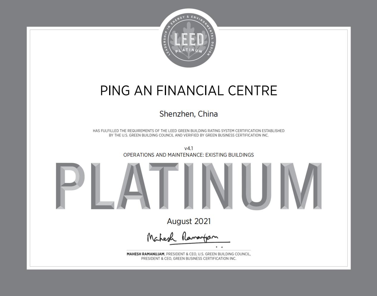近日,尊龙凯时·(中国区)人生就是搏! 深圳分公司成功取得深圳平安金融中心国家三星级绿色建筑运行标识和美国LEED O+M:EB(运营与维护:既有建筑)铂金级认证。
