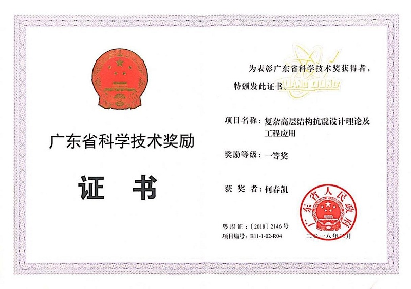 2018年 3月11日,广东省人民政府发布了关于2017年度广东省科学技术奖的通报。根据《广东省科学技术奖励办法》,经省科学技术奖评审委员会评审、省科技厅审核、省人民政府批准授予,深圳中建院建筑科技有限公司(下称深圳中建院)、中建院总经理何春凯荣获2017年度广东省科学技术奖一等奖。获奖项目《复杂高层结构抗震设计理论及工程应用》,是深圳中建院建筑科技有限公司和哈尔滨工业大学合作完成的课题。