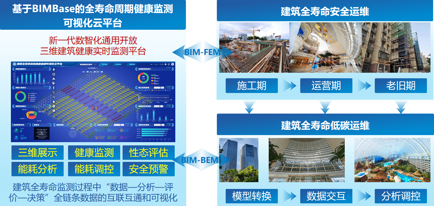 “建筑安全与能耗数字化集成监测关键技术”科技成果针对现阶段建筑安全及能耗整体综合性能状态的分析、理解、预警难度大,结构安全与建筑能耗运维效率低下,海量建筑数字信息安全可控能力差的突出问题,面向我国“数字住建”建设发展目标,积极响应数字化转型背景下建筑全寿命周期内健康与绿色运维的重大需求,搭建了基于国产自主知识产权BIMBase的建筑全寿命周期健康监测可视化云平台,提出了建筑围护结构与主体结构关联性分析与一体化监测技术,开发了建筑在实际运行边界条件下的最优能效仿真平台,研制了基于BIMBase平台的建筑信息模型到建筑能耗模型的高效转换工具,形成了建筑安全与能耗数字化集成监测成套关键技术体系,增强了专业领域核心竞争力。