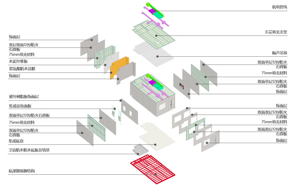 深圳市人民医院宝安医院感染性疾病防治中心结构主体采用钢结构,内部采用嵌入式MiC(Modular Integrated Construction)模块化病房及MiMEP(Module-based MiMEP)装配式机电模块集成建造技术。项目共采用101个模块化病房,整体装配率达80%以上,《建筑工业化评价标准》试评价等级为AA级装配式建筑。项目将成为国内首个永久性嵌入式MiC模块化感染性防治病房,同时也是国内首个“模块化负压感染防治病房”,为“模块化机电+模块化建筑”的集成建造方式提供了参考示范。